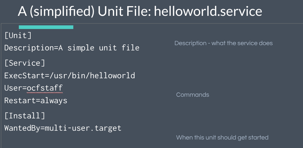 Service behavior defined by systemd unit files How should this service start up? How should it respond to various systemctl management commands?